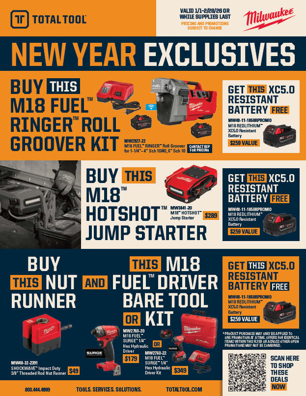 CURRENT FLYERS 2026 TOTAL TOOL NEW YEAR EXCLUSIVES FLYER NUT RUNNER PRODUCT FLYER SPRING FLYER 2026 CATALOGS & SOLUTIONS GUIDES CONCRETE GUIDE ELECTRICAL HAND TOOLS PPE CATALOG MX FUEL POSITIONING GUIDE BATTERY & CHARGER POSITIONING GUIDE MX FUEL QUICK REFERENCE GUIDE SITE LIGHTING GUIDE MX FUEL SERVICE SOLUTIONS MX FUEL CUT OFF SAW SELL SHEET PRESS SOLUTIONS GUIDE PORTABLE POWER POSITIONING GUIDE ONE-KEY PROGRAM GUIDE STEEL PIPE POSITIONING GUIDE